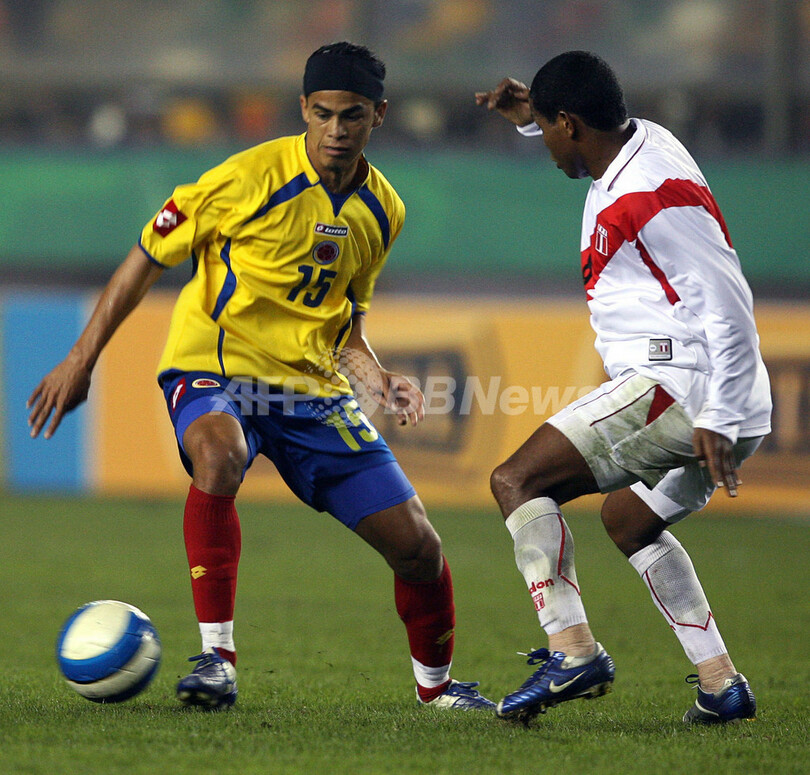 ディフェンスで立ちはだかるペルーのファン・ハージョ(%%Juan Jayo%%、右)の前でボールをコントロールするコロンビアのジュリアン・アンチコ(%%Yulian Anchico%%)。(c)AFP/JAIME RAZURI