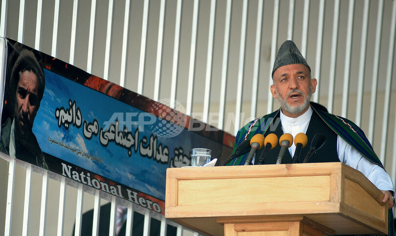 カルザイ大統領はこれまで2回の暗殺未遂事件を経験しており、関係者によると、式典が行われていた会場の外では、会場に入場しようとしていた数千人の人々により混乱が生じていた。(c)AFP