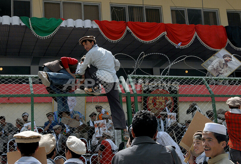 カルザイ大統領はこれまで2回の暗殺未遂事件を経験しており、関係者によると、式典が行われていた会場の外では、会場に入場しようとしていた数千人の人々により混乱が生じていた。(c)AFP