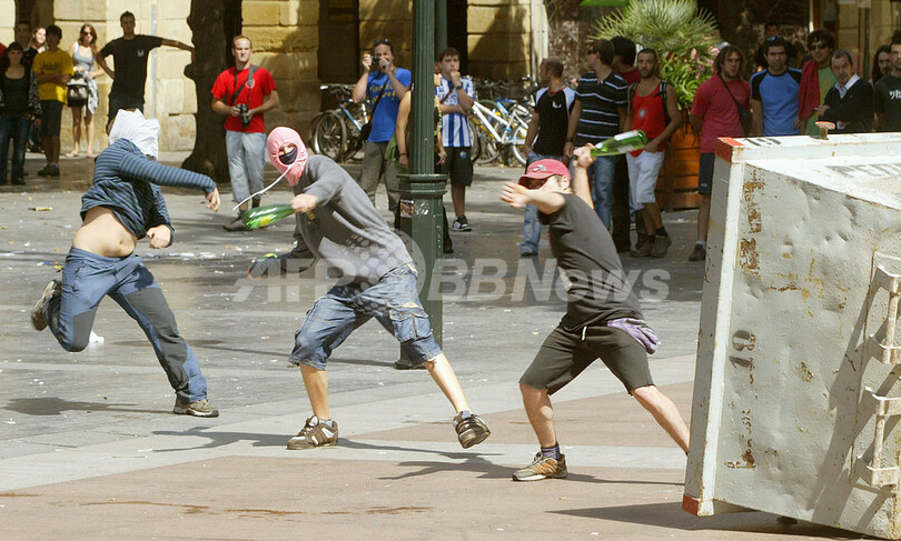 同日には、バスク地方のサン・セバスチャン(San Sebastian)で、警察当局による最近の取り締まりで逮捕されたETAのメンバーの呼びかけで、ETA支持者らがメンバーの釈放を求める非合法デモを行った。(c)AFP