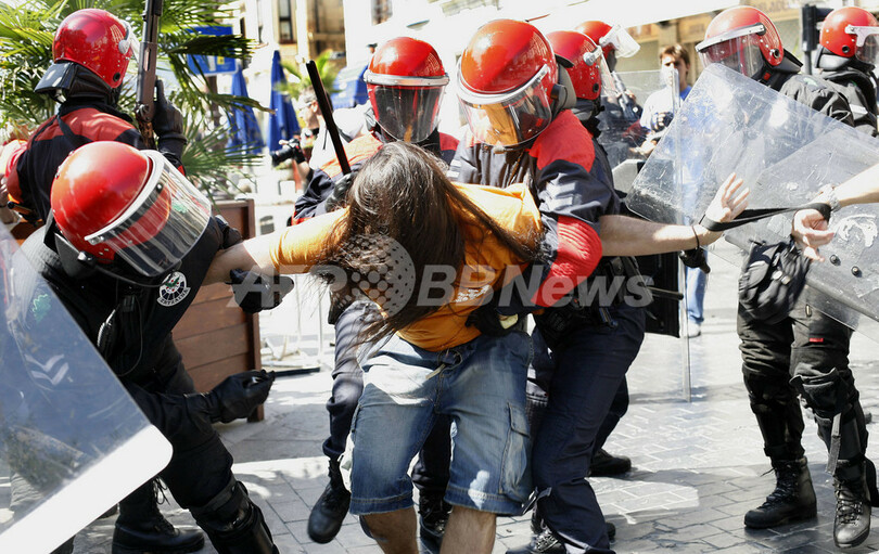 同日には、バスク地方のサン・セバスチャン(San Sebastian)で、警察当局による最近の取り締まりで逮捕されたETAのメンバーの呼びかけで、ETA支持者らがメンバーの釈放を求める非合法デモを行った。(c)AFP