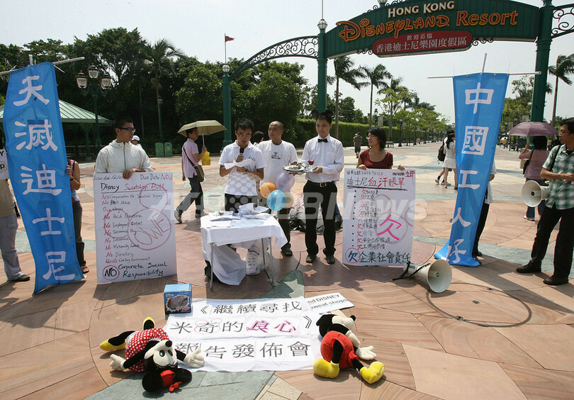 ニュース 政治・経済 香港ディズニーランド2周年記念日に抗議デモ 2007年9月13日 23:26 発信地:香港 このニュースをシェア ‹ › ❮ 4/7 ❯ 2007年9月12日、開園2周年を迎えた香港ディズニーランドのメインゲート前で、ディズニーのぬいぐるみを置いて同園の労働条件に抗議する活動家ら。(c)AFP/MIKE CLARKE 画像作成中 ! 【9月13日 AFP】香港ディズニーランド(Disneyland)が開園から2周年を迎えた12日、学生と労働運動家が組織するSACOM(Students and Scholars Against Corporate Misbehaviour)が、同園のメインゲート前で労働者の権利保護を訴え納入業者に対するディズニーの行動規範違反に抗議した。(c)AFP 政治・経済 一覧へ> メディア・報道関係・法人の方向け 写真・動画 購入のお問合せ>