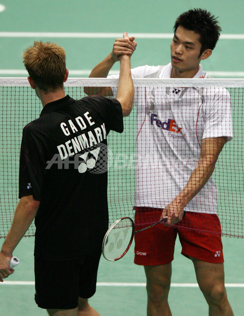 【9月14日 AFP】バドミントン、スーパーシリーズ(Super Series)第8戦、ヨネックス・オープン・ジャパン(YONEX OPEN JAPAN 2007)・男子シングルス準々決勝。大会第1シードのリン・ダン(Lin Dan、中国)は、大会第6シードのピーター・ゲード(Peter Gade、デンマーク)と対戦。リンはセットカウント2-0(21-16、21-19)でゲードを降し、準決勝進出を決めた。(c)AFP/TOSHIFUMI KITAMURA