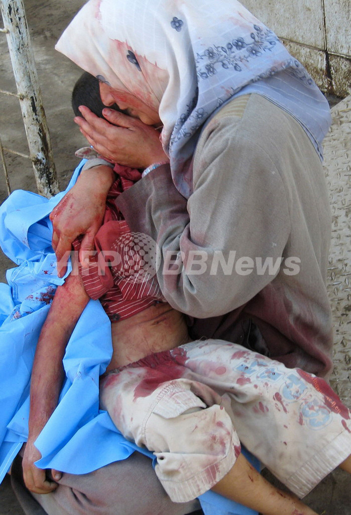 2007年9月16日、イラクのバクバ(Baquba)で狙撃されて死亡した息子の遺体を抱きしめて語りかける母親。(c)AFP