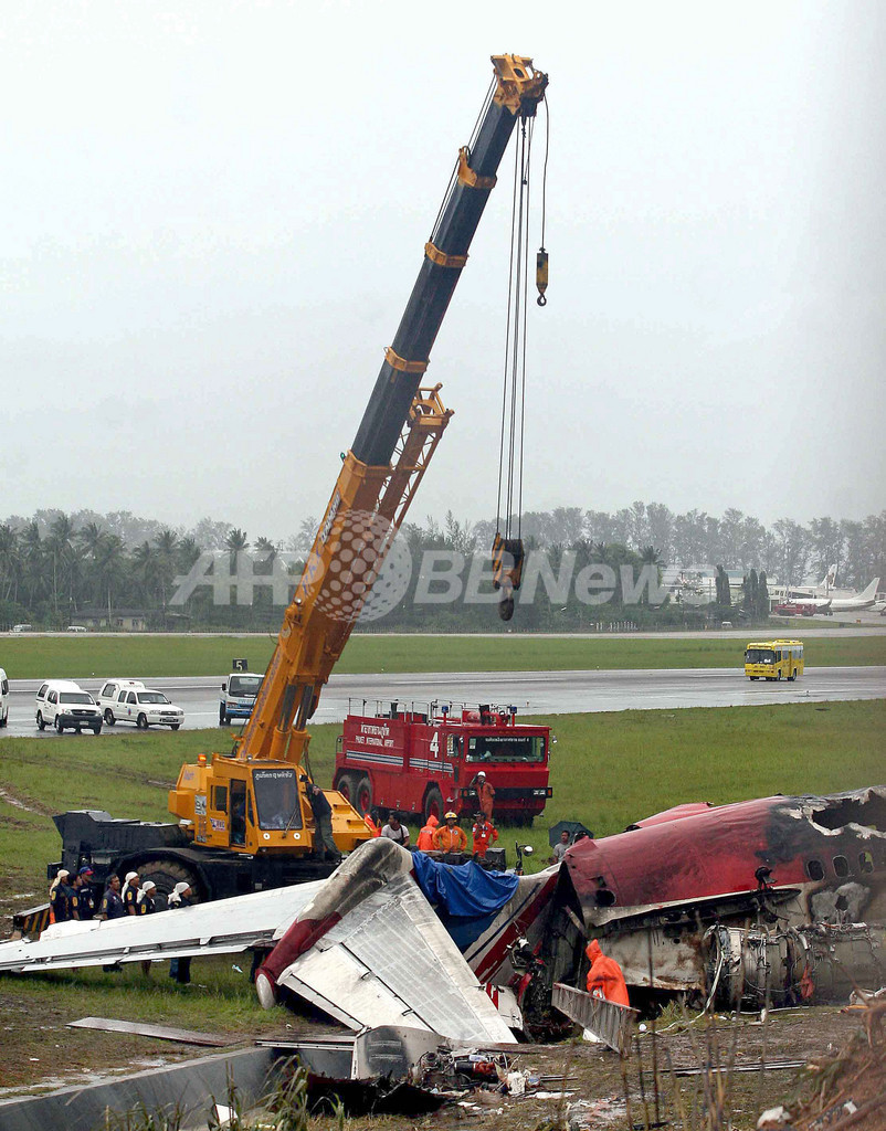 【9月17日 AFP】(一部更新)タイ南部のリゾート地、プーケット(Phuket)島の国際空港で16日、タイ航空会社ワンツーゴー(One-Two-Go)の旅客機(乗客乗員130人)が着陸に失敗し炎上した事故で、残がいの除去などとともに原因究明作業が進められている。同事故による死者は89人に上り、過去10年間のタイ国内の航空機事故で最多となった。犠牲者のうち55人は外国籍の乗客だと当局は発表している。
