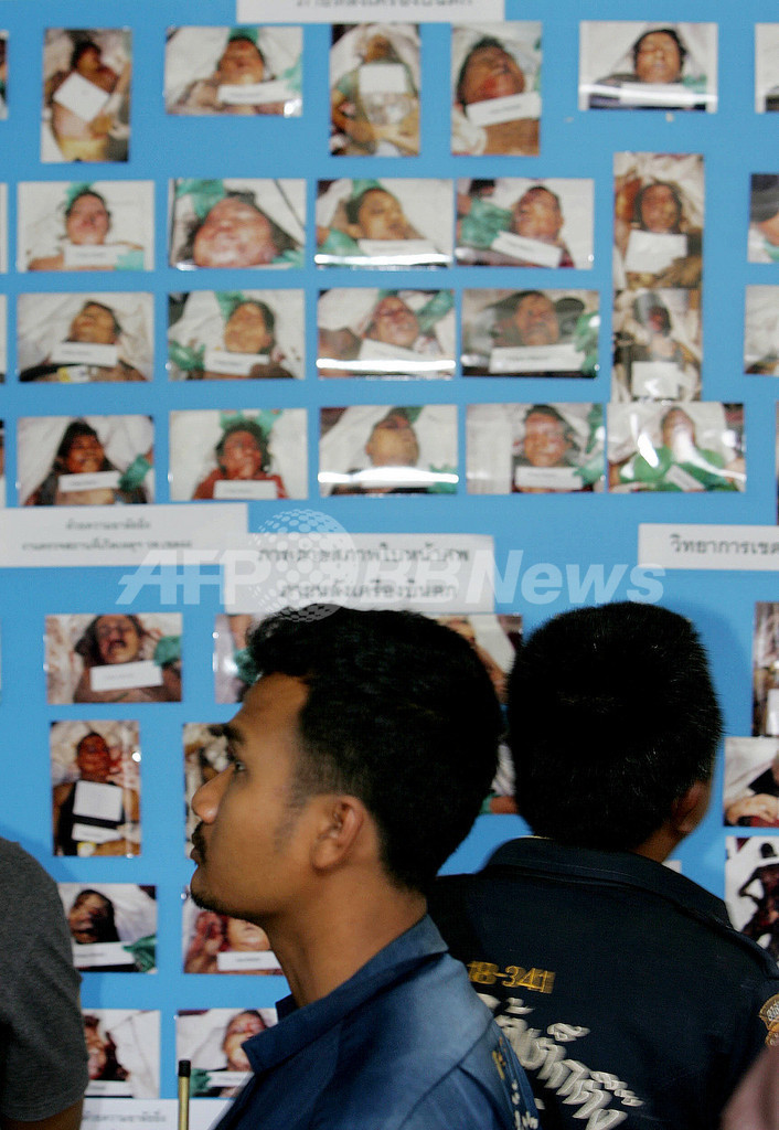 2007年9月17日タイのプーケット(Phuket)島で、前日のタイ航空会社ワンツーゴー(One-Two-Go)旅客機の炎上事故の犠牲者の写真を確かめる救助隊員ら。(c)AFP/Pornchai KITTIWONGSAKUL