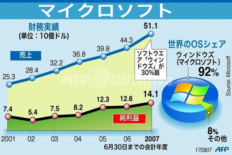【9月18日 AFP】欧州第1審裁判所(European Court of First Instance、CFI)は17日、米ソフトウエア大手マイクロソフト(Microsoft)に制裁金4億9700万ユーロ(約795億円)の支払いを命じた欧州委員会(European Commission)の決定を支持した。図は同社の財務実績およびOSソフト「ウィンドウズ」の世界シェアを示したもの。(c)AFP