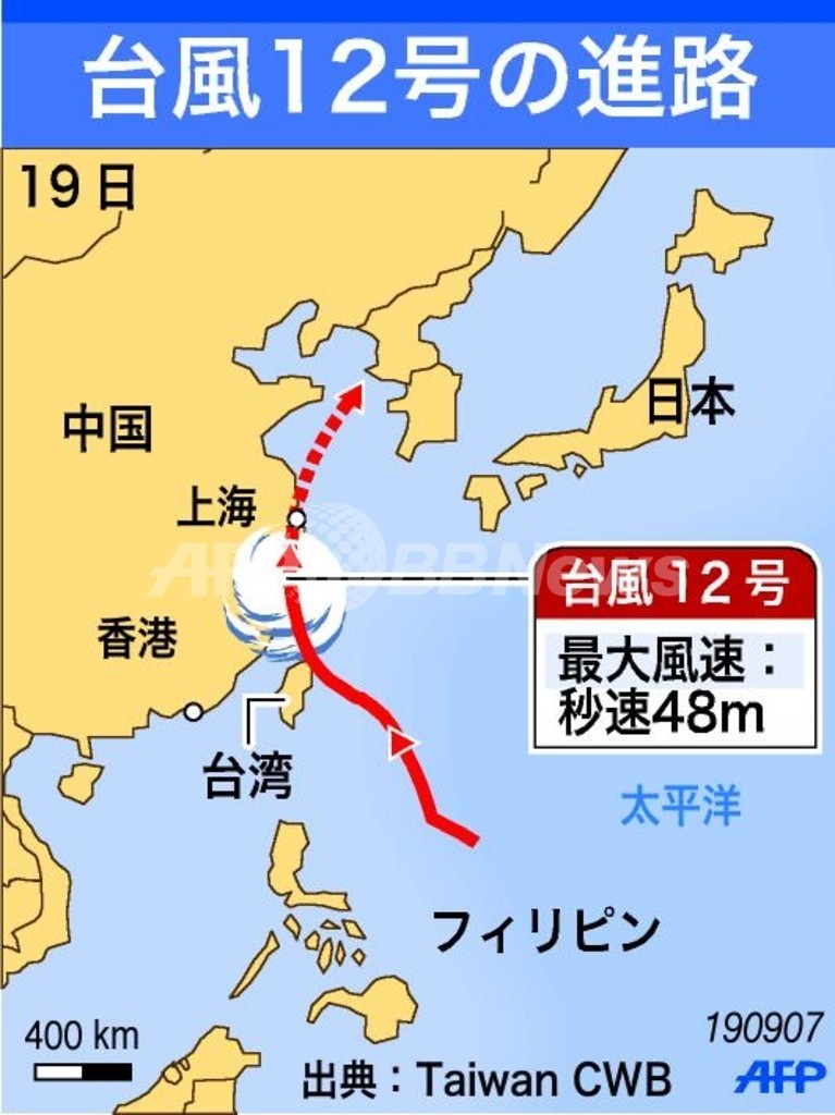 ニュース 社会 図解 非常に強い台風12号、上海へ向かう 2007年9月19日 15:05 発信地:台湾 [ 中国・台湾 台湾 ] このニュースをシェア (c)AFP 【9月19日 AFP】台風12号の予想進路図。中国東部に上陸した非常に強い台風12号「ウィパー(Wipha)」は19日、上海(Shanghai)に接近している。(c)AFP<ニュース解説画像一覧へ> 社会 一覧へ> メディア・報道関係・法人の方向け 写真・動画 購入のお問合せ>
