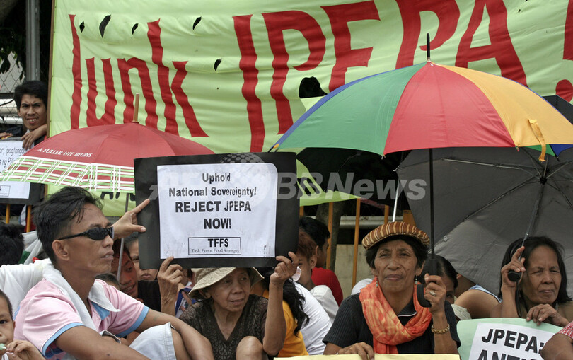 ニュース 政治・経済 マニラで日比経済連携協定に抗議行動 2007年9月21日 16:11 発信地:マニラ/フィリピン [ アジア・オセアニア フィリピン ] このニュースをシェア ‹ › ❮ 2/2 ❯ 2007年9月20日、マニラ(Manila)郊外で、日本・フィリピン経済連携協定(JPEPA)に反対し座り込みを行う人々。(c)AFP/Luis Liwanag 画像作成中 ! 【9月21日 AFP】フィリピンの首都マニラ(Manila)郊外で20日、日本・フィリピン経済連携協定(Japan-Philippines Economic Partnership Agreement、JPEPA)に反対する人々が抗議の座り込みを行った。同国上院議会では、同協定批准の是非を問う公聴会が行われている。(c)AFP 政治・経済 一覧へ> メディア・報道関係・法人の方向け 写真・動画 購入のお問合せ>