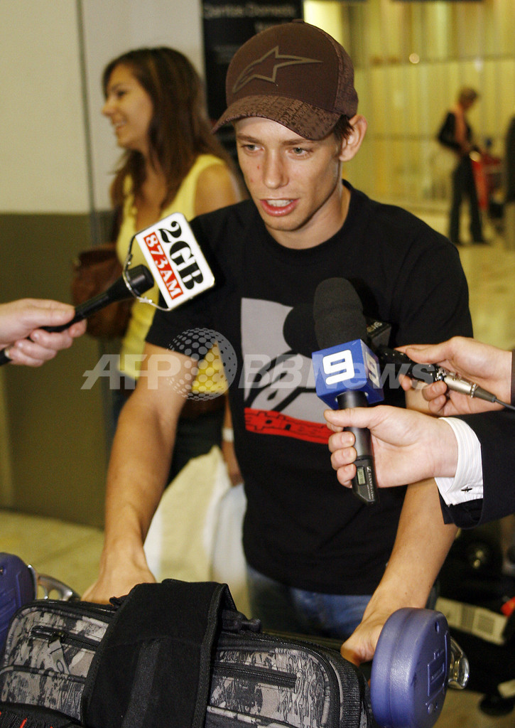 【9月25日 AFP】世界ロードレース選手権(WGP)のMotoGPクラスで総合優勝を決めたオーストラリアのケーシー・ストーナー(Casey Stoner)が25日、シドニー国際空港(Sydney International Airport)に到着した。ストーナーは9月23日に行われた第15戦の日本GPで6位を獲得し、総合2位につけるバレンティーノ・ロッシ(Valentino Rossi)とのポイント差を広げ、シーズン3戦を残し史上2番目の若さ(21歳と342日)での年間王者に輝いた。(c)AFP
