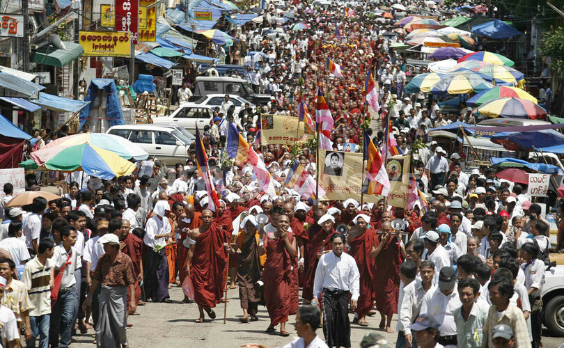 前日の10万人規模のデモを受け、市内各所では軍事政権の当局者が数台のトラックから拡声器で、デモに参加しないよう市民らに呼び掛けた。しかし、仏教の旗や仏像などを手にした僧侶3万人がヤンゴン中心部に向かって行進。スーレー・パゴダ( Sule Pagoda)付近で市民ら約7万人が合流した。中には民主化運動指導者のアウンサンスーチー(Aung San Suu Kyi)さんが書記長を務める国民民主連盟(National League for Democracy、NLD)のシンボルであるクジャクの旗を手にした学生や、「非暴力運動」の横断幕を掲げた参加者もいた。