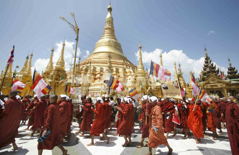 前日の10万人規模のデモを受け、市内各所では軍事政権の当局者が数台のトラックから拡声器で、デモに参加しないよう市民らに呼び掛けた。しかし、仏教の旗や仏像などを手にした僧侶3万人がヤンゴン中心部に向かって行進。スーレー・パゴダ( Sule Pagoda)付近で市民ら約7万人が合流した。中には民主化運動指導者のアウンサンスーチー(Aung San Suu Kyi)さんが書記長を務める国民民主連盟(National League for Democracy、NLD)のシンボルであるクジャクの旗を手にした学生や、「非暴力運動」の横断幕を掲げた参加者もいた。