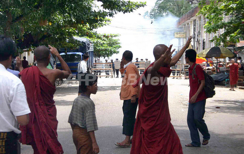 【9月26日 AFP】(一部更新、写真追加)ミャンマーの最大都市ヤンゴン(Yangon)で、軍事政権に対する抗議デモに参加していた僧侶や学生など数千人に対し、治安部隊および警察が武力鎮圧へ乗り出した。集会に対し催涙弾などが発射されたほか、警察が群衆を殴打、僧侶を含む数十人が身柄を拘束された。
