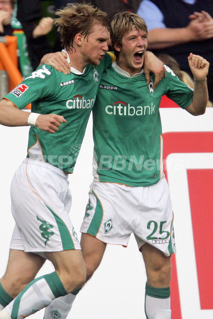 スポーツ サッカー ブレーメン 大量8得点を奪いビーレフェルトに圧勝 2007年9月30日 4:09 発信地:ブレーメン/ドイツ [ ヨーロッパ ドイツ ] このニュースをシェア ‹ › ❮ 3/4 ❯ 前半17分に先制点を決めてペア・メルテザッカー(%%Per Mertesacker%%、左)と喜びを分かち合うブレーメンのペーテル・ニーメイアー(%%Peter Niemeyer%%)。(c)AFP/DDP/NIGEL TREBLIN 画像作成中 ! 【9月30日 AFP】サッカー、07-08ドイツ・ブンデスリーガ1部・第8節、ヴェルダー・ブレーメン(Werder Bremen)vsアルミニア・ビーレフェルト(Arminia Bielefeld)。試合は大量8得点を挙げたブレーメンが8-1で快勝した。(c)AFP サッカー 一覧へ> メディア・報道関係・法人の方向け 写真・動画 購入のお問合せ>