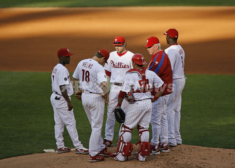 【9月30日 AFP】07MLB、フィラデルフィア・フィリーズ(Philadelphia Phillies)vsワシントン・ナショナルズ(Washington Nationals)。試合はフィリーズが2-4でナショナルズに敗れた。ナショナルリーグの東地区で優勝争いをするニューヨーク・メッツ(New York Mets)が同日に行われたフロリダ・マーリンズ(Florida Marlins)戦に13-0と快勝し、フィリーズとメッツはゲーム差無しで首位に並んだため、地区優勝の行方は10月1日に行われるレギュラーシーズンの最終戦へ持ち越された。(c)AFP
