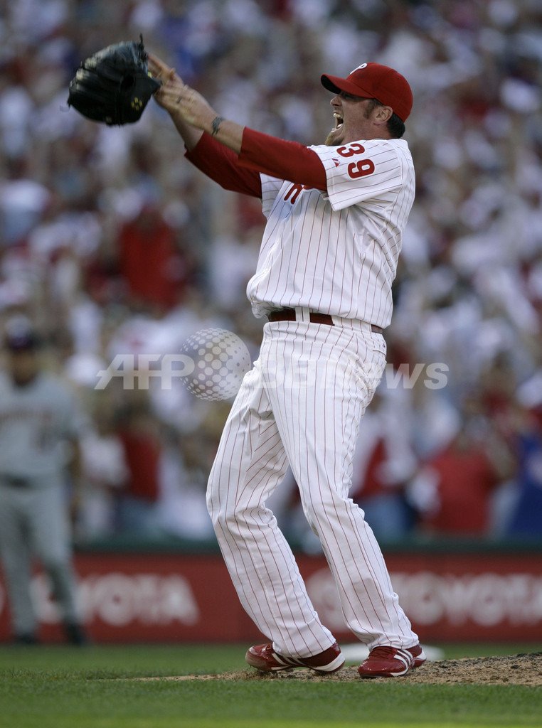 【10月1日 AFP】07MLB、フィラデルフィア・フィリーズ(Philadelphia Phillies)vsワシントン・ナショナルズ(Washington Nationals)。試合はフィリーズが6-1でナショナルズを降し。ナショナルリーグ東地区で首位に並ぶニューヨーク・メッツ(New York Mets)が同日行われたフロリダ・マーリンズ(Florida Marlins)戦に1-8で敗れたため、フィリーズは1993年シーズン以来14年ぶりのナショナルリーグ東地区での優勝を決めた。(c)AFP