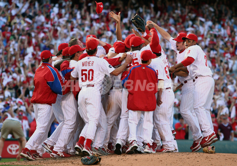 【10月1日 AFP】07MLB、フィラデルフィア・フィリーズ(Philadelphia Phillies)vsワシントン・ナショナルズ(Washington Nationals)。試合はフィリーズが6-1でナショナルズを降し。ナショナルリーグ東地区で首位に並ぶニューヨーク・メッツ(New York Mets)が同日行われたフロリダ・マーリンズ(Florida Marlins)戦に1-8で敗れたため、フィリーズは1993年シーズン以来14年ぶりのナショナルリーグ東地区での優勝を決めた。(c)AFP