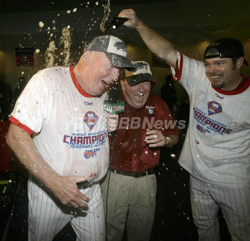 【10月1日 AFP】07MLB、フィラデルフィア・フィリーズ(Philadelphia Phillies)vsワシントン・ナショナルズ(Washington Nationals)。試合はフィリーズが6-1でナショナルズを降し。ナショナルリーグ東地区で首位に並ぶニューヨーク・メッツ(New York Mets)が同日行われたフロリダ・マーリンズ(Florida Marlins)戦に1-8で敗れたため、フィリーズは1993年シーズン以来14年ぶりのナショナルリーグ東地区での優勝を決めた。(c)AFP