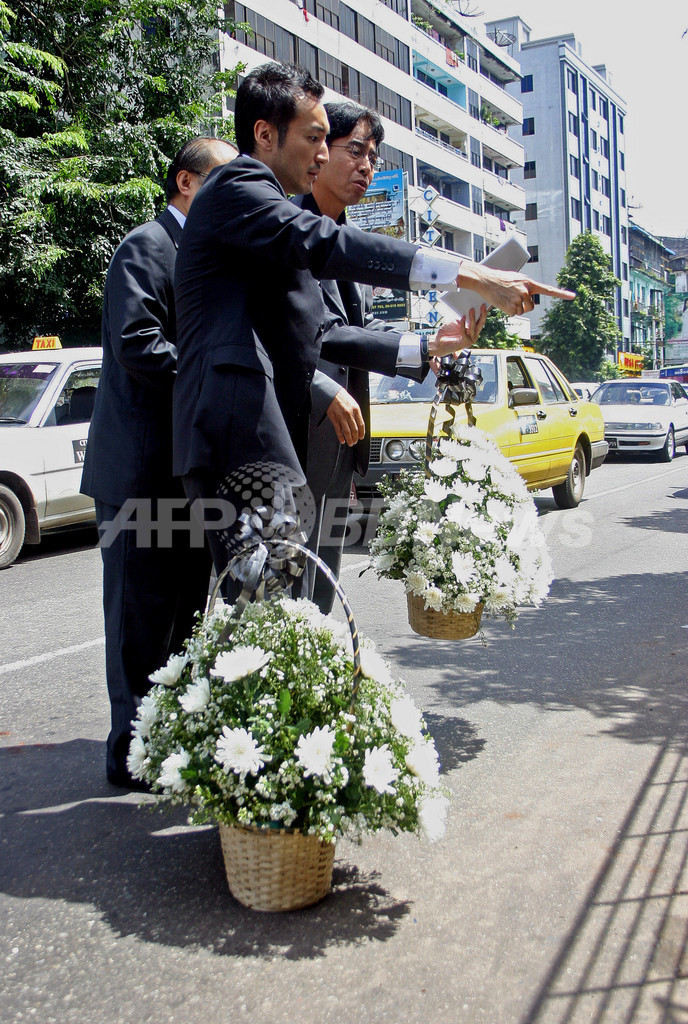 山路代表は在ヤンゴン日本大使館の職員2人に付き添われて現場を訪問。長井さんが倒れていた路上にひざまずいて地面に手を触れ、大きな白い花かごを2つ、現場に手向けた。3人はろうそくを手にして頭を垂れ、黙とうをささげていたという。