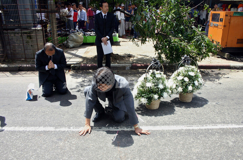 山路代表は在ヤンゴン日本大使館の職員2人に付き添われて現場を訪問。長井さんが倒れていた路上にひざまずいて地面に手を触れ、大きな白い花かごを2つ、現場に手向けた。3人はろうそくを手にして頭を垂れ、黙とうをささげていたという。