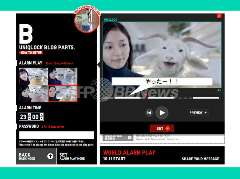 さらに、「ユニクロック」を貼り付けたユーザーの数や所在国を世界地図上に表示する「ワールド・ユニクロック(WORLD. UNIQLOCK)」ページには、自動的にユーザーのブログを紹介する「ブログ紹介機能」や、予め設定した時間に好きなメッセージを送信できる「アラームプレイ機能」を追加した。