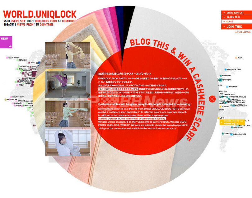 また、10月11日より、「ユニクロック」をブログに貼り付けたユーザーの中から抽選で全14色のカシミヤビッグストールの中から1色を、1日1名にプレゼントするという。(c)MODE PRESS