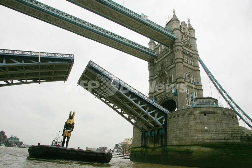 【10月3日 AFP】ロンドン(London)中心部で1日、ジャッカルの頭を持つエジプト神話の神「アヌビス(Anubis)」のレプリカ(全長7メートル)をボートに乗せてテムズ(Thames)川をさかのぼるパフォーマンスが行われた。これは、11月にロンドンで始まる「ツタンカーメンと古代エジプト王の黄金時代 (Tutankhamun and the Golden Age of the Pharaohs)」展の宣伝活動の一環。(c)AFP