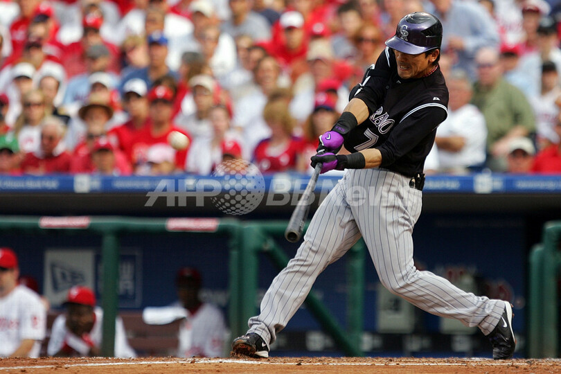 【10月5日 AFP】07MLBプレーオフ、ナ・リーグ地区シリーズ、フィラデルフィア・フィリーズ(Philadelphia Phillies)vsコロラド・ロッキーズ(Colorado Rockies)第2戦。1番・二塁で先発出場したロッキーズの松井稼頭央(Kazuo Matsui)は、4回表に迎えた第3打席でプレーオフ第1号満塁本塁打を放つなど5打数3安打5打点を記録。試合はロッキーズが10-5でフィリーズに連勝し、リーグ優勝決定シリーズ進出へ王手をかけた。
