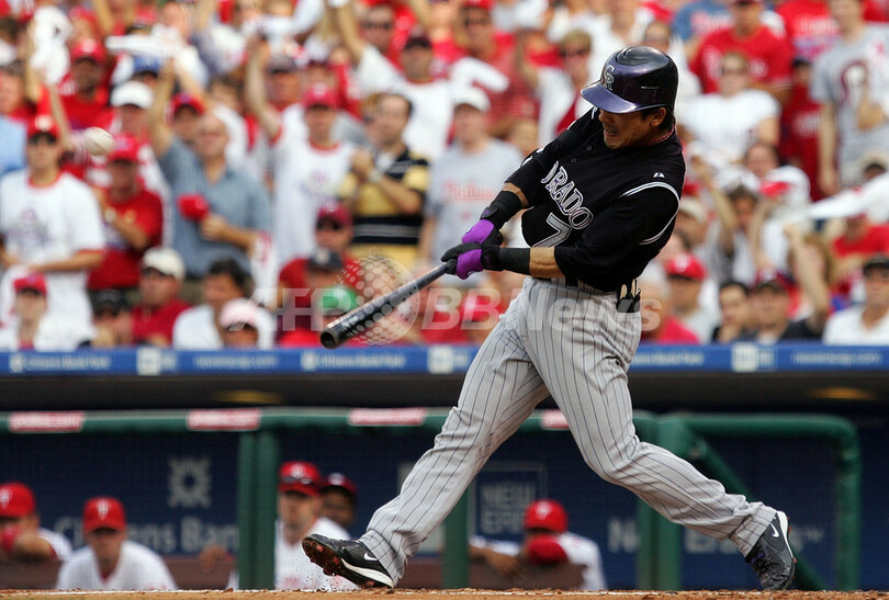 【10月5日 AFP】07MLBプレーオフ、ナ・リーグ地区シリーズ、フィラデルフィア・フィリーズ(Philadelphia Phillies)vsコロラド・ロッキーズ(Colorado Rockies)第2戦。1番・二塁で先発出場したロッキーズの松井稼頭央(Kazuo Matsui)は、4回表に迎えた第3打席でプレーオフ第1号満塁本塁打を放つなど5打数3安打5打点を記録。試合はロッキーズが10-5でフィリーズに連勝し、リーグ優勝決定シリーズ進出へ王手をかけた。