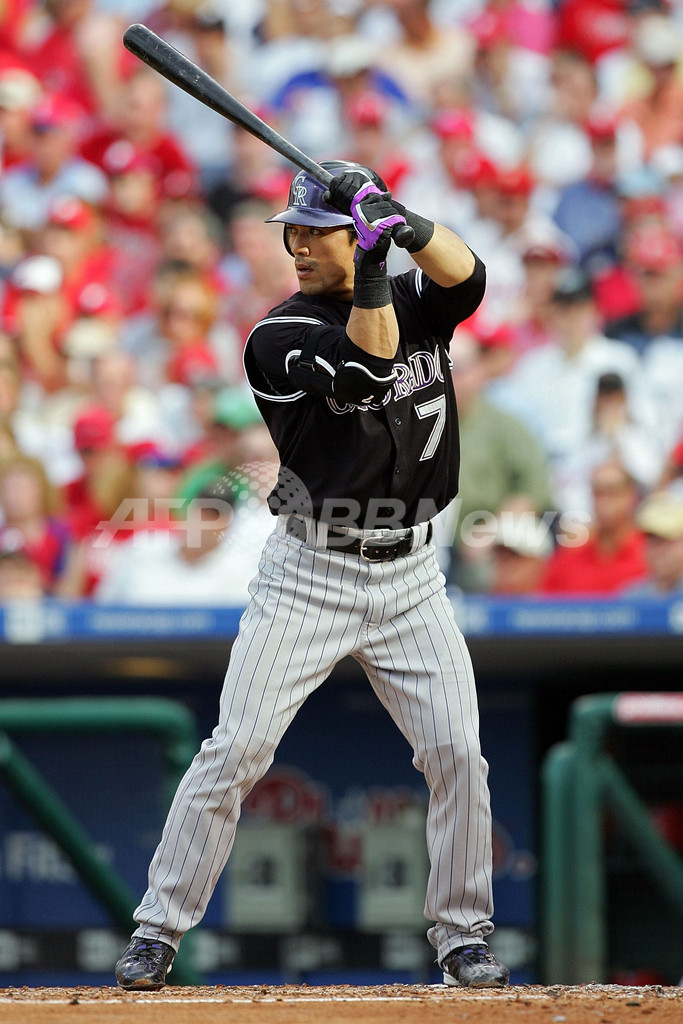 【10月5日 AFP】07MLBプレーオフ、ナ・リーグ地区シリーズ、フィラデルフィア・フィリーズ(Philadelphia Phillies)vsコロラド・ロッキーズ(Colorado Rockies)第2戦。1番・二塁で先発出場したロッキーズの松井稼頭央(Kazuo Matsui)は、4回表に迎えた第3打席でプレーオフ第1号満塁本塁打を放つなど5打数3安打5打点を記録。試合はロッキーズが10-5でフィリーズに連勝し、リーグ優勝決定シリーズ進出へ王手をかけた。