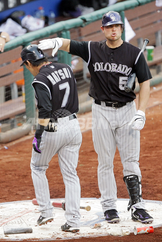 【10月5日 AFP】07MLBプレーオフ、ナ・リーグ地区シリーズ、フィラデルフィア・フィリーズ(Philadelphia Phillies)vsコロラド・ロッキーズ(Colorado Rockies)第2戦。1番・二塁で先発出場したロッキーズの松井稼頭央(Kazuo Matsui)は、4回表に迎えた第3打席でプレーオフ第1号満塁本塁打を放つなど5打数3安打5打点を記録。試合はロッキーズが10-5でフィリーズに連勝し、リーグ優勝決定シリーズ進出へ王手をかけた。