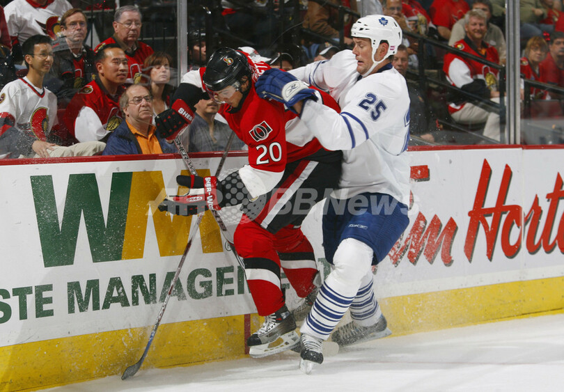 スポーツ ウインタースポーツ セネターズ メープルリーフスを降す 2007年10月5日 16:01 発信地:オタワ/カナダ [ 北米 カナダ ] このニュースをシェア ‹ › ❮ 7/9 ❯ メープルリーフスのハル・ギル(%%Hal Gill%%、右)と競り合うセネターズのアントワ・バルメイ(%%Antoine Vermette%%)。(c)AFP/Getty Images Phillip MacCallum 画像作成中 ! 【10月5日 AFP】07-08NHL、オタワ・セネターズ(Ottawa Senators)vsトロント・メープルリーフス(Toronto Maple Leafs)。試合はセネターズが3-2でメープルリーフスを降した。(c)AFP/Getty Images ウインタースポーツ 一覧へ> メディア・報道関係・法人の方向け 写真・動画 購入のお問合せ>