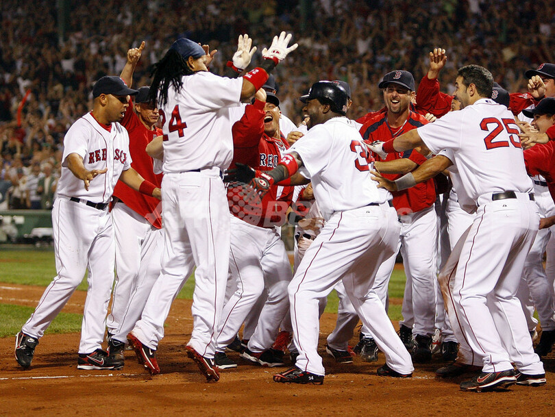 【10月6日 AFP】07MLBプレーオフ、ア・リーグ地区シリーズ、ボストン・レッドソックス(Boston Red Sox)vsロサンゼルス・エンゼルス・オブ・アナハイム(Los Angeles Angels of Anaheim)第2戦。試合は3-3の同点で迎えた9回裏にマニー・ラミレス(Manny Ramirez)が3点本塁打を放ち3-6でレッドソックスがサヨナラ勝ちを収め、レッドソックスは2連勝を飾りリーグ優勝決定シリーズ進出へ王手をかけた。(c)AFP