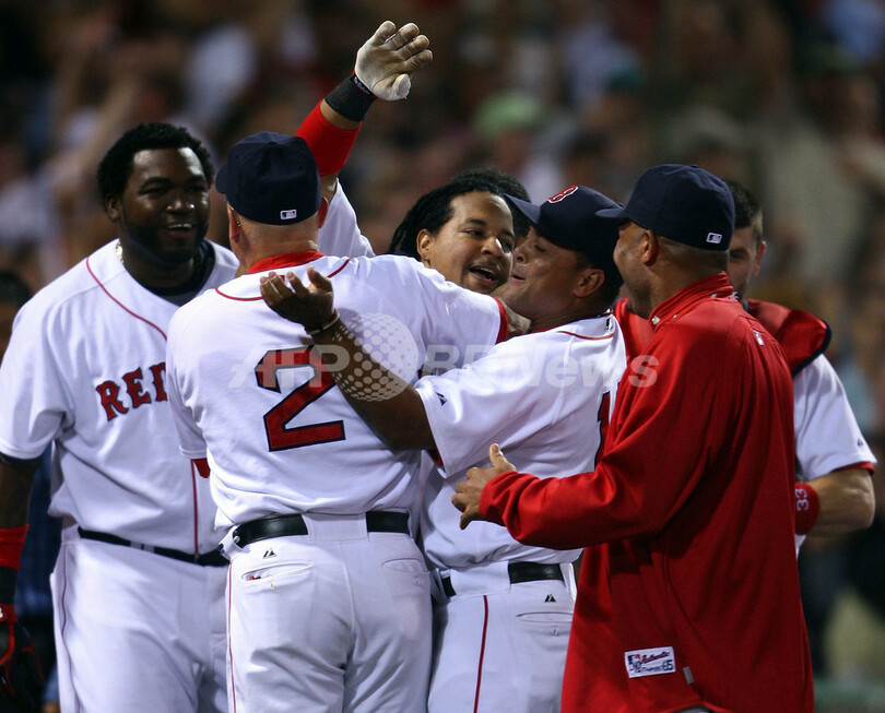【10月6日 AFP】07MLBプレーオフ、ア・リーグ地区シリーズ、ボストン・レッドソックス(Boston Red Sox)vsロサンゼルス・エンゼルス・オブ・アナハイム(Los Angeles Angels of Anaheim)第2戦。試合は3-3の同点で迎えた9回裏にマニー・ラミレス(Manny Ramirez)が3点本塁打を放ち3-6でレッドソックスがサヨナラ勝ちを収め、レッドソックスは2連勝を飾りリーグ優勝決定シリーズ進出へ王手をかけた。(c)AFP