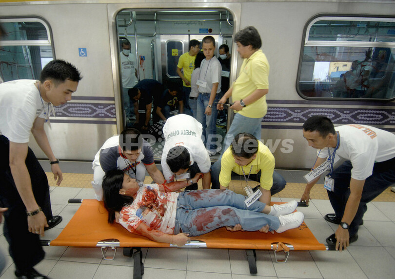 ニュース 戦争・紛争 血まみれの犠牲者、爆弾テロ被害を模擬訓練で検証 2007年10月7日 7:51 発信地:マニラ/フィリピン [ アジア・オセアニア フィリピン ] このニュースをシェア ‹ › ❮ 1/5 ❯ 2007年10月6日、鉄道網を標的とする爆弾テロ被害を検証する模擬実験で、血まみれになって担架に乗せられた犠牲者役の女性を運ぶ救急隊員。(c)AFP/Jay DIRECTO 画像作成中 ! 【10月7日 AFP】(写真追加)テロリストが鉄道車両を爆破、血まみれの犠牲者が床に横たわる――といっても、これは爆弾テロを想定した模擬訓練の一幕。フィリピンでは2000年12月30日、死者22人、負傷者100人以上を出す鉄道爆破テロ事件が発生。7年目を迎える今年、爆弾テロ攻撃の被害を想定した訓練が実施された。同国南部では最近も爆弾攻撃により2人が死亡、30人以上が負傷する事件が発生している。(c)AFP 戦争・紛争 一覧へ> メディア・報道関係・法人の方向け 写真・動画 購入のお問合せ>