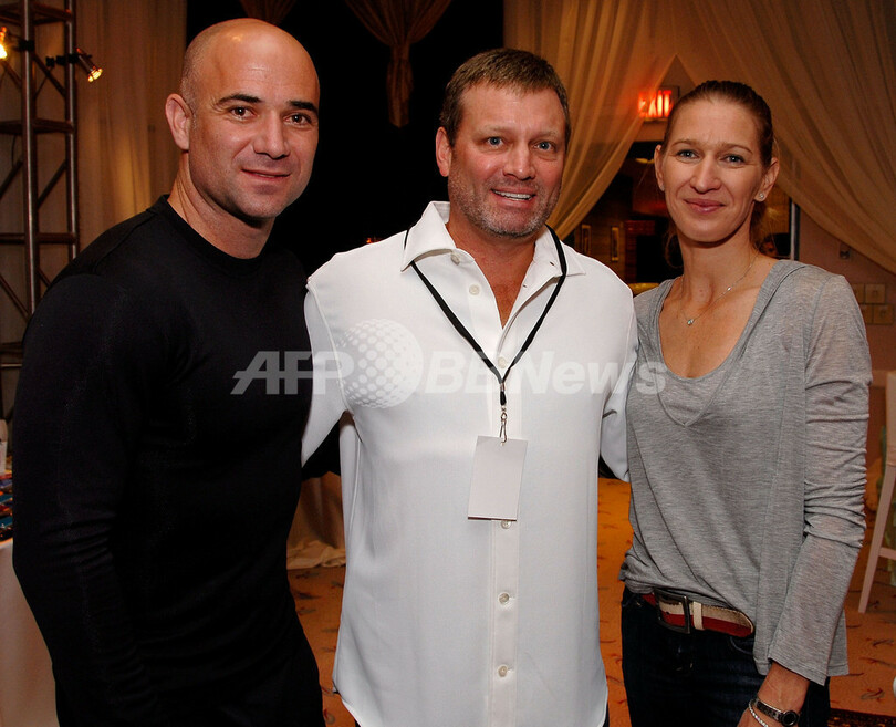2007年10月6日、アンドレ・アガシ・チャリティ基金(Andre Agassi Charitable Foundation)主催の「第12回子供たちのグランドスラム(The 12th Grand Slam for Children)」で開催されたDistinctive Assets社のギフティングイベントに参加するアンドレ・アガシ(Andre Agassi、左)と妻でテニス選手のシュテフィ・グラフ(%%Steffi Graf%%、右)、%%Tyler Candle Company%%CEOの%%Eric Horton%%氏。(c)AFP/Getty Images Charley Gallay