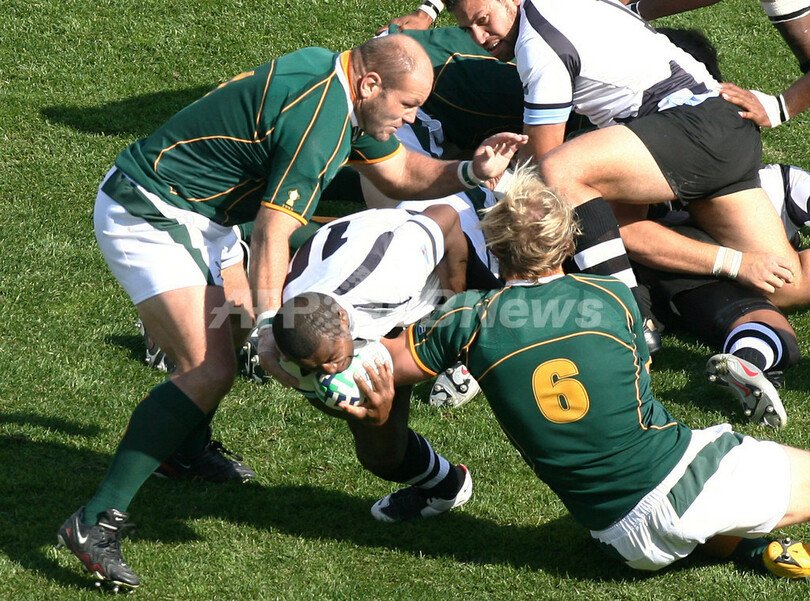 【10月8日 AFP】07ラグビーW杯・決勝トーナメント・準々決勝、南アフリカ(スプリングボクスSpringboks)vsフィジー。試合はスプリングボクスが37-20でフィジーを降し、準決勝進出を決めた。スプリングボクスは(現地)14日の準決勝で、アルゼンチンvsスコットランドの勝者と対戦する。