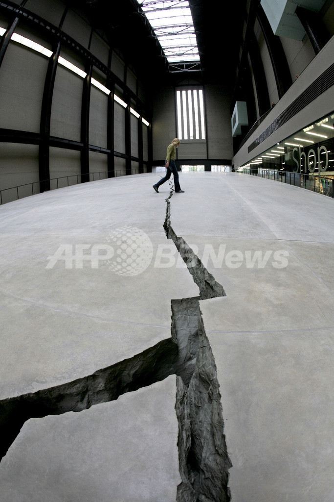 この展示は同美術館内にある奥行き167メートルの「タービン・ホール(Turbine Hall)」のコンクリートの床に、「ひび」を表現したもの。ひびは髪の毛の細さのものに始まり、徐々に太く深くなり、床をジクザグにはう。制作には1年、展示には5週間かかったという。
