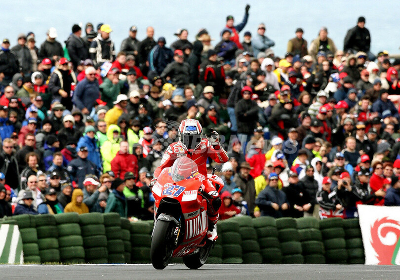 【10月14日 AFP】世界ロードレース選手権(WGP)・第16戦・オーストラリアGP・MotoGPクラス、ウォームアップ走行。ドゥカティ・マールボロ(Ducati Marlboro)のケーシー・ストーナー(Casey Stoner)は、15周を走行しベストラップ1分30秒860を記録して1位につけた。決勝でストーナーはスペインのダニエル・ペドロサ(Dani Pedrosa)やイタリアのバレンティーノ・ロッシ(Valentino Rossi)に続いて3番グリッドからスタートする。(c)AFP