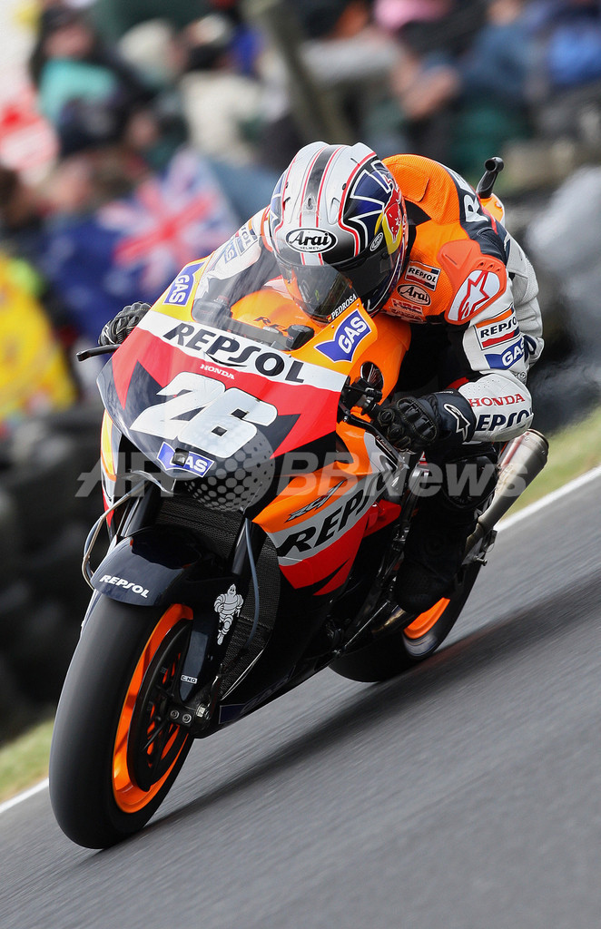【10月14日 AFP】世界ロードレース選手権(WGP)・第16戦・オーストラリアGP・MotoGPクラス、ウォームアップ走行。ドゥカティ・マールボロ(Ducati Marlboro)のケーシー・ストーナー(Casey Stoner)は、15周を走行しベストラップ1分30秒860を記録して1位につけた。決勝でストーナーはスペインのダニエル・ペドロサ(Dani Pedrosa)やイタリアのバレンティーノ・ロッシ(Valentino Rossi)に続いて3番グリッドからスタートする。(c)AFP