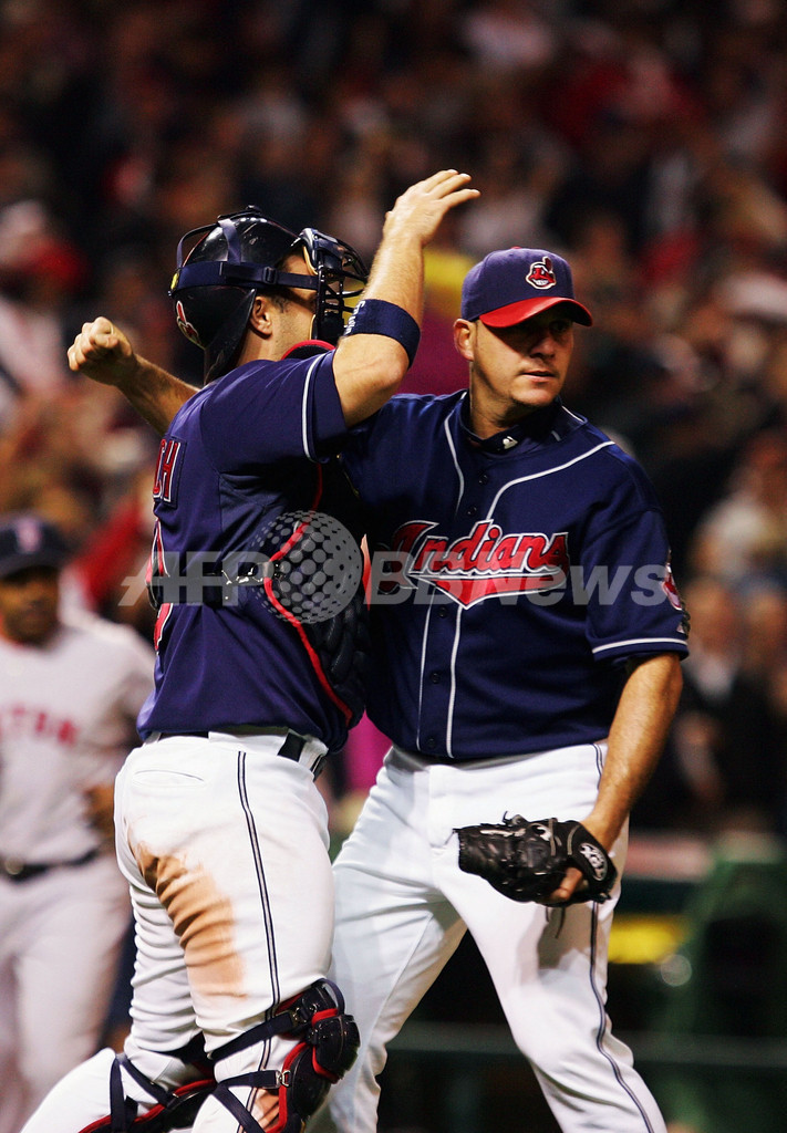 【10月17日 AFP】07MLBプレーオフ、ア・リーグ優勝決定シリーズ、クリーブランド・インディアンス(Cleveland Indians)vsボストン・レッドソックス(Boston Red Sox)、第4戦。5回に先頭打者のケーシー・ブレーク(Casey Blake)のソロ本塁打で先制したインディアンスは、ジョニー・ペラルタ(Jhonny Peralta)の3点本塁打などで一気に7点をリードし、7-3でレッドソックスを降し3連勝でリーグ優勝に王手をかけた。(c)AFP/Getty Images