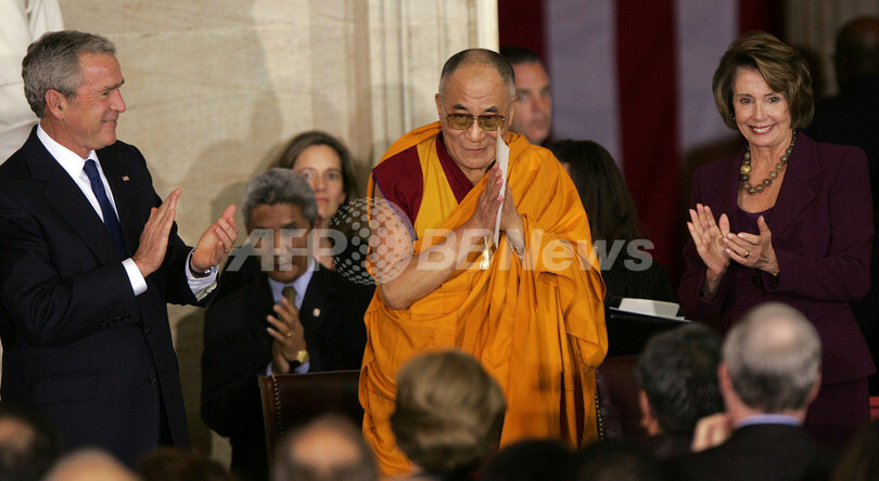 ダライ・ラマはブッシュ大統領とナンシー・ペロシ(Nancy Pelosi)下院議長に伴われて授与式に臨んだ。授与された議会名誉黄金勲章は、米国議会から民間人に贈られる最高の栄誉。中国政府からは大きな反発を招いている。(c)AFP