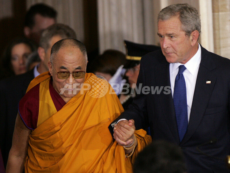 【10月18日 AFP】ジョージ・W・ブッシュ(George W. Bush)米大統領は17日、米議会で行われたチベット仏教の最高指導者ダライ・ラマ(Dalai Lama)14世への「議会名誉黄金勲章(Congressional Gold Medal)」授与式に出席、現職の米大統領として初めてダライ・ラマと公の場に姿を見せた。16日の会談も含め、ブッシュ大統領はこれまで、ダライ・ラマと「私的」な会談は行ってきたが、これまではすべて非公式。