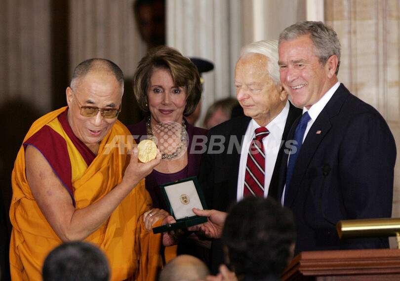ダライ・ラマはブッシュ大統領とナンシー・ペロシ(Nancy Pelosi)下院議長に伴われて授与式に臨んだ。授与された議会名誉黄金勲章は、米国議会から民間人に贈られる最高の栄誉。中国政府からは大きな反発を招いている。(c)AFP