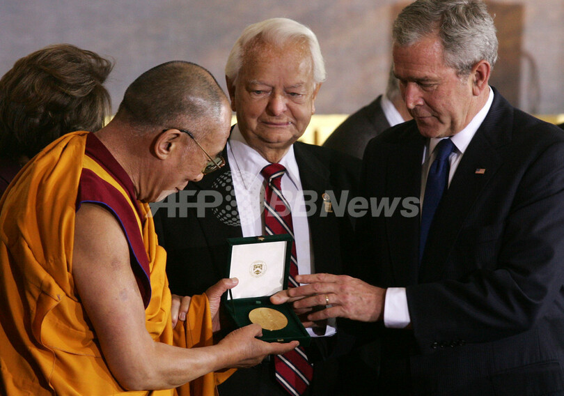 【10月18日 AFP】ジョージ・W・ブッシュ(George W. Bush)米大統領は17日、米議会で行われたチベット仏教の最高指導者ダライ・ラマ(Dalai Lama)14世への「議会名誉黄金勲章(Congressional Gold Medal)」授与式に出席、現職の米大統領として初めてダライ・ラマと公の場に姿を見せた。16日の会談も含め、ブッシュ大統領はこれまで、ダライ・ラマと「私的」な会談は行ってきたが、これまではすべて非公式。