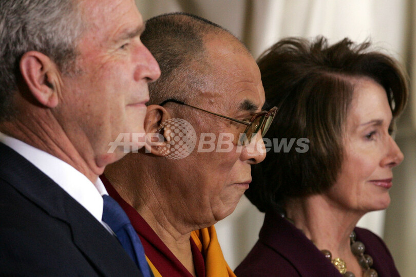 ダライ・ラマはブッシュ大統領とナンシー・ペロシ(Nancy Pelosi)下院議長に伴われて授与式に臨んだ。授与された議会名誉黄金勲章は、米国議会から民間人に贈られる最高の栄誉。中国政府からは大きな反発を招いている。(c)AFP