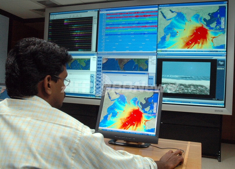 【10月18日 AFP】インド国立海洋情報サービスセンター(Indian National Centre for Ocean Information Services、INCOIS)の津波早期警報センター(Tsunami Early Warning centre)に設置された新しい津波警報システムが17日、公開された。このシステムは地震発生の13分後には津波警報を出せる。また、最終的には7分以内の警報発令を目指すという。(c)AFP
