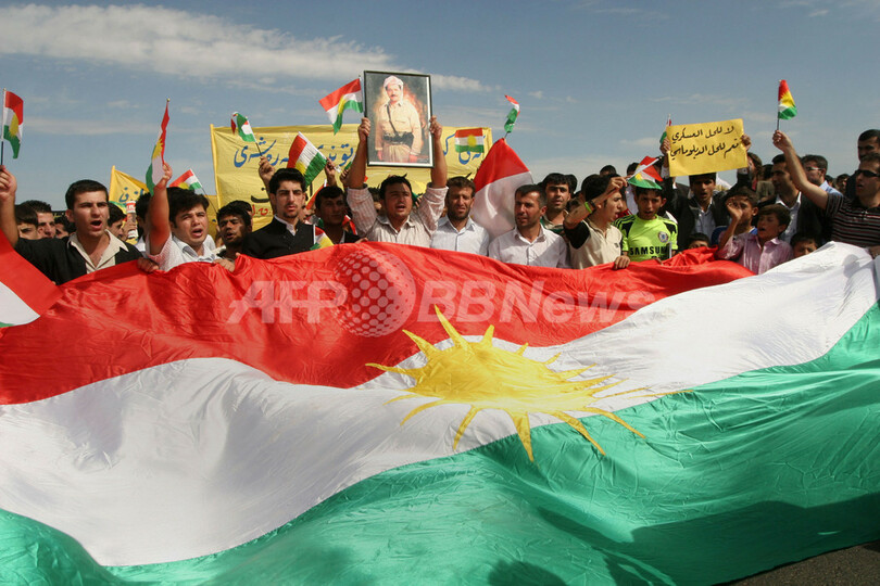 の肖像画を掲げ、トルコ議会が越境軍事行動を認める法案を可決したことに抗議するクルド人ら。(c)AFP/SAFIN HAMED