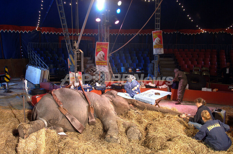 ニュース ライフ こぼれ話 フランス史上初のゾウの手術 2007年10月20日 19:26 発信地:リヨン/フランス [ ヨーロッパ フランス ] このニュースをシェア ‹ › ❮ 3/7 ❯ 2007年10月19日、リヨン(Lyon)で、干し草の寝床にゾウのLechme(41)を寝かせて白内障手術を行う医療チーム。(c)AFP/JEAN-PHILIPPE KSIAZEK 画像作成中 ! 【10月20日 AFP】フランスのリヨン(Lyon)で19日、フランスで初めてなるゾウの白内障の手術が行われた。手術を受けたのはMedranoサーカスのLechme(41)で、執刀チームにはフランス人眼科医のほか、仏・独の教授らが携わり、手術は成功した。(c)AFP ライフ 一覧へ> メディア・報道関係・法人の方向け 写真・動画 購入のお問合せ>