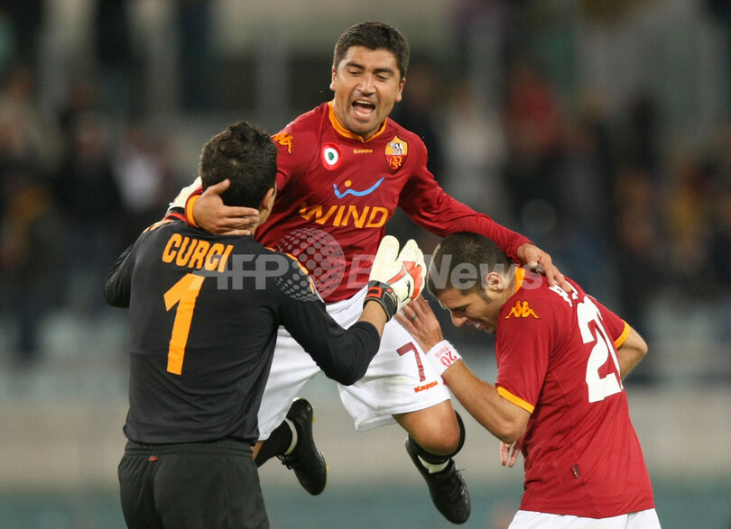 スポーツ サッカー ローマ ホームでナポリと4-4の引き分け 2007年10月21日 9:33 発信地:ローマ/イタリア [ ヨーロッパ イタリア ] このニュースをシェア ‹ › ❮ 6/7 ❯ ジャンルカ・クルチ(%%Gianluca Curci%%、左)とシモーネ・ペロッタ(%%Simone Perrotta%%、右)とジャンプして歓喜するローマのダビド・ピサロ(%%David Pizarro%%)。(c)AFP/CHRISTOPHE SIMON 画像作成中 ! 【10月21日 AFP】サッカー、07-08イタリア・セリエA・第8節、ASローマ(AS Roma)vsナポリ(Napoli)。試合は壮絶な打ち合いの末4-4のの引き分けに終わった。(c)AFP サッカー 一覧へ> メディア・報道関係・法人の方向け 写真・動画 購入のお問合せ>